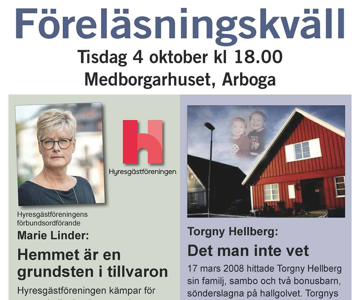 Hyresgästföreningen bjuder in till en innehållsrik föreläsning på tisdag 4 oktober klockan 18.00 i Medborgarhuset i Arboga. Där får du lyssna till förbundsordförande Marie Linder som berättar om hur hyresgästföreningen jobbar för trygghet i hemmet på flera plan, och där alla ska ha möjlighet att skapa sig ett hem på schyssta villkor. Under kvällen får du även ett personligt möte med Torgny Hellberg som drabbades av en fruktansvärd tragedi i det egna hemmet som påverkade hela hans familj. Föreläsningskvällen är öppen för alla och har fri entré.